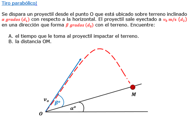 x= Vo t cos ( alfa + beta) ...................................................y= Vo t sen ( alfa + beta) - 0.5 g t^2