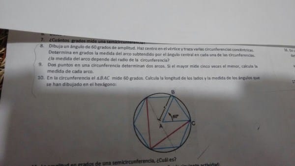 Un Hexágono regular inscrito en una circunferencia tiene los lados iguales al radio de la circunferencia. Con su centro, podemos dibujar seis triángulos equiláteros (obviamente con todos sus lados iguales al radio y sus ángulos de 60°, por ser equilátero).
