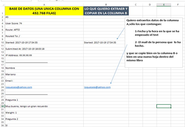 De las 432.768 celdas (o filas) hay algunas que están escritas (con Fecha y Hora, Mail u otros textos) y hay otras que están vacías. Normalmente por una escrita, la siguiente está vacía.