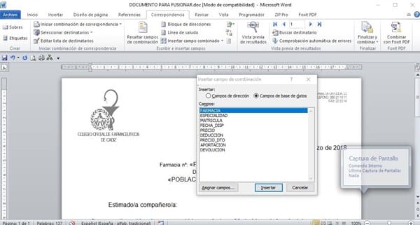 La macro Prueba2 me sigue dando error de "el elemento no está disponible" en la línea "Let cadena = ActiveDocument.MailMerge.DataSource.DataFields("FARMACIA").Value"