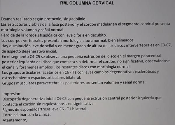 Me hice este examen porque desde hace más de 1 mes sentía anormalidades en mis extremidades, empezó en el lado derecho, sentía como si mi brazo se hubiera debilitado, como si perdiera "firmeza" y lo sentía como laxo, como si la musculatura estuviese aflojada, aunque la fuerza nunca la he perdido. Posteriormente a la semana siguiente eso se me pasó al lado izquierdo, me hice resonancia al cerebro que salió normal y para complementar me mandaron a hacer a la cervical y arrojo esto, quisiera saber que significa todo esto y si tiene relación con mis sintomas