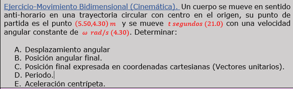 Un cuerpo se mueve en sentido anti-horario en una trayectoria circular con centro en el origen, su punto de partida es el punto y se mueve con una velocidad angular constante de . Determinar:Un cuerpo se mueve en sentido anti-horario en una trayectoria circular con centro en el origen, su punto de partida es el punto y se mueve con una velocidad angular constante de