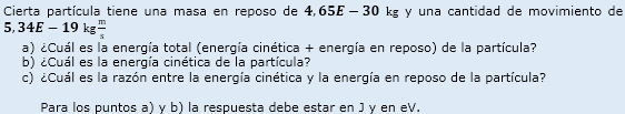 Energia cinetica de la particula = Energia Total – Energia de reposo = 16 x 10^-11 kg ( m/s)^2 - 4.65 E-30 kg x 9 x 10^16 ( m/s)^2 = 15.96 x 10^-11 kg( m/s)^2)