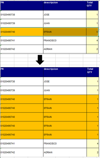 Así com se muestra en la imagen, todo esto aplicada a cada renglón que la cantidad sea mayor a 1