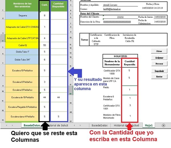 Tengo un ListBox donde saca toda su información de una hoja llamada BasedeDatos cuya hoja tiene 3 columnas (Nombre, Cantidad y Cantidad Disponible) y al seleccionar un items en mi listbox se va a mi hoja1 donde tienen 2 columnas (Nombre y Cant. Requerida) .Lo que quiero es que al yo seleccionar cualquier items en mi listbox y se vaya a mi hoja1, se reste mis columnas "Cantidad Requerida" de mi hoja1 con la columna "Cant." de mi hoja BasedeDatos y el resultado aparezca en mi hoja BasedeDatos en la columna de "Cantidad Disponible" No se si me hago entender por favor que alguien me ayude.
