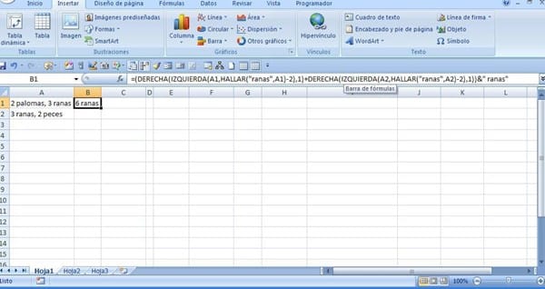 Tengo en la celda A1( 2 palomas, 3 ranas), en la celda A2 ( 3 ranas, 2 peces). Quiero que me devuelva en B1 la suma de las "3 ranas de A1" con las "3 ranas de A2" dando me como resultado en B1 "6 ranas".