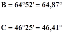 En un triángulo ABC, los ángulos B y C miden 64°52’ y 46°25′ respectivamente. Se traza la