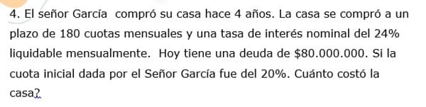 $$\begin{align}&a= \frac{C·i}{1-(1+i)^{-n}}= \frac{0.02·C}{1-(1.02)^{-180}}=\\&\\&0.020582736466724·C\\&\\&\text{Tasladamos deuda y pagos al mes 48 y lo restamos}\\&\text{para determinar el saldo vivo}\\&\\&Saldo_{48}= C(1.02)^{48}- 0.020582736466724·C· \frac{1.02^{48}-1}{0.02}=\\&\\&2.5870703855·C - 0.1633312575·C=2.423739128·C\\&\\&\text{Y esta es la deuda a los 4 años, luego:}\\&\\&2.423739128·C=80000000\\&\\&C =\frac{80000000}{2.423739128}=$33006852,54\\&\\&\text{Y si la cuota incial dada fue el 20% entonces C es el 80% del precio}\\&\\&0.8 ·Precio=$33006852,54\\&\\&Precio =\frac{$33006852,54}{0.8}=$41258565,68\end{align}$$