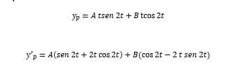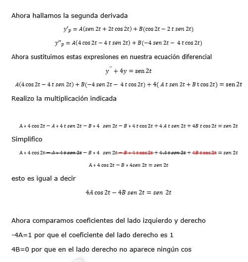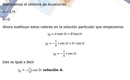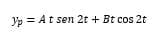 Entonces para hallar la solución particular nos fijamos en el tipo de función que esta al lado derecho, en este caso y proponenos una solución en la que pondremos una constante por el seno t y otra constante por el cos t (siempre se debe colocar seno y coseno cuando tenemos una función trigonométrica de la forma seno o coseno según el caso) y luego derivamos dos veces ya que es una ecuación de segundo orden