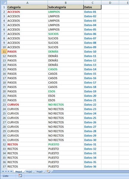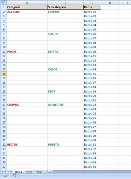 Tengo celdas ocupadas de tres columnas, A, B Y C, con algunas celdas con datos en las columnas A y B, y datos hasta una fila determinada en la C, de la forma que se aprecia en la imagen inicial.