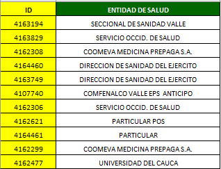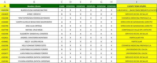 Necesito realizar un buscarv en VBA dado que al momento de ejecutar un botón el me realice el cruce y me le asigne el nombre de la entidad de salud de la base 2 a la base uno utilizando el ID; Solamente si es posible " que los datos que coincidan el les coloque uno y a los que no les coloque 0" en la ultima columna de la base 1 que esta en amarillo.