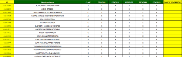 Esta es la base 1 donde en la primera columna en amarillo tengo el ID y deseo asignar la información de la ultima columna teniendo como referencia la información de la base dos que también tiene ID.