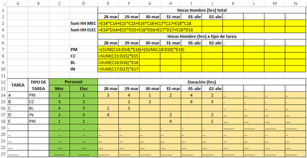 Y para la tabla Horas Hombre (hrs) x tipo de tarea que en base al tipo de tarea (columna B) de como resultado una sumatoria en la celda E7, la suma del personal (Mec + Elec) y lo multiplique por la duración, en base al dato que se tenga en la celda D7 (PM) y así sucesivamente para todo el rango de tareas y fechas.