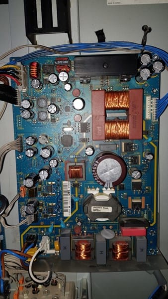 Buenos días, no veo ningún condensador hinchado, tengo un multimetro con el que he podido ver que mientras hay sonido por la salida de los altavoces de entre 1.2 y 2.5 ohmios, cuando se acaba el sonido ya no da ningún valor, el multimetro tiene termómetro y por lo que vi los condensadores de la parte de arriba a la izquierda llegan a unos 40 grados cuando se va el sonido, los demás no pasan de 30 , no se donde se conecta la placa de sonido, subo una foto de la parte trasera.
