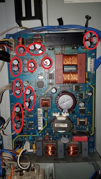 Entre el condensador 1 y el grupo de 2 parece que hay un triac, aunque imagino que no sera un triac, sera un 78XX o un 79XX un regulador de voltaje, posiblemente un 7805 o un 7905 (para regular el voltaje a 5V) Se ve en la foto en mal estado(como si hubiera un crater en la parte de arriba), pero se ve tan borroso que no te sabria decir. ¿Puedes confirmar que realmente se vea fisicamente bien? Confirma que no sea ese el que tiene el problema por que quizas has enfriado ese junto con los condensadores.