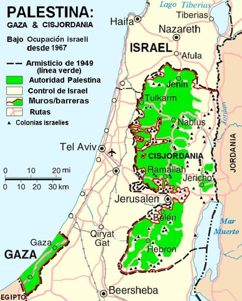La zona BLANCA es el Estado de Israel, la zona VERDE es la zona que pertenece a PALESTINA.