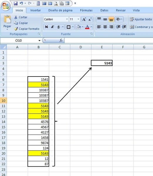Ejemplo: en la celda E3 coloco un numero, si el numero se encuentra en el rango seleccionado (B6:B22)esas celdas donde se encuentran el numero ingresado en E3