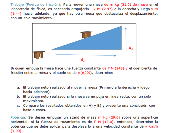 Trabajo (Fuerza de fricción). Para mover una mesa de m kg (31.0) de masa en el laboratorio de física, es necesario empujarla