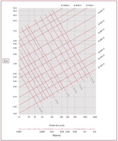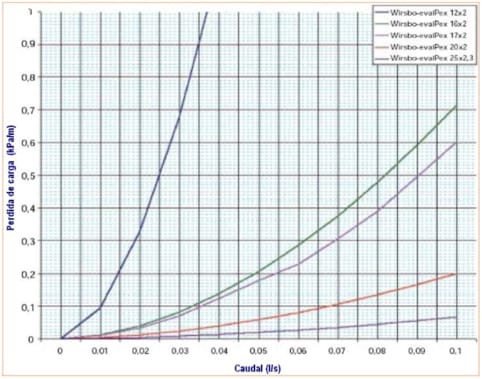 La pérdida de carga de la tubería la calculamos según un ábaco que cada fabricante debe facilitarnos. Es importante apuntar que debemos seleccionar una tubería que nos permita trabajar con una velocidad en torno a 1 m/seg o inferior, para evitar ruidos en la instalación. También sería deseable no sobrepasar una pérdida de carga de 40 mmcda/metro.