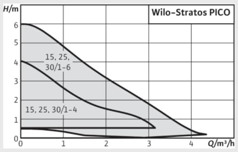 Según las curvas de la bomba Wilo_Stratos PICO, los modelos 15, 25 y 30 /1-4 serían capaces de trabajar con esas condiciones. Lo lógico por tanto, en este caso es elegir la primera de ellas.