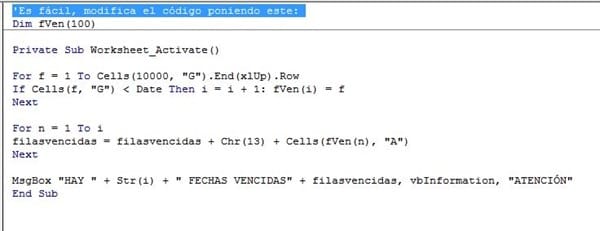 Me gustaría crear una macro en excel que se ejecute automáticamente donde por ejemplo tenga una columna(sopongamos que estén en la columna G5:G100) donde estén puras fechas y cuando las fechas se vayan venciendo osea sean mayor al día de hoy a una fecha en especifico me aparezca un msgbox que me diga que ya se venció y si en caso son varios que me digan aquellos que se han vencido( supongamos que se me venció G5 y sus datos están C5 entonces que en el texbox me aparezca el mensaje que se venció tal producto alguna ayuda por favor maestros con una macro con algunas ayudas para poder ejecutarla o un ejemplo de como hacerlo con comentarios dentro de la misma macro