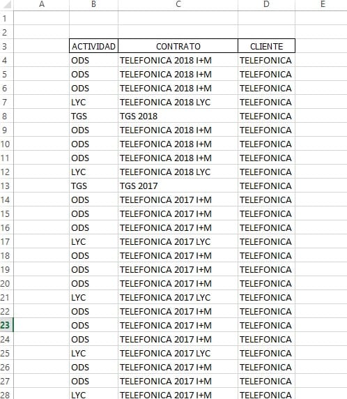 Por ejemplo, si en el filtro 1 elijo ODS en el desplegable 2 me debe aparecer todos estos contratos. O bien selecciono uno de los contratos o que tenga opción a seleccionar todos. Lo mismo en el filtro 1, que me permita elegir una Actividad o todas. Cada desplegable de la derecha debe vincularse al resultado del desplegable anterior. Si dejara todos los filtros en blanco me gustaría que aparecieran todas las posibles combinaciones sin que hubieran datos repetidos.