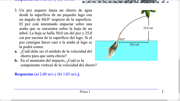 Como podes hallar t = tiempo del recorrido del chorro da agua = Ex/ Vo( cos alfa) = 0.50 / 2.85 x 0.5 = 0.35 seg. .............te quedaria: