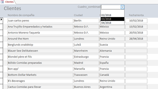 He creado un formulario que se basa en esta tabla. Y necesito poder filtrar los registro del formulario según el mes y el año que se indiquen en el campo "Fecha_Corte". No lo he podido lograr ( no se exactamente como y si hay alguna forma, me gustaría saberla) Por lo que he creado campos calculados en base al campo "Fecha_Corte", que me muestre el mes y el año basados en cada fecha: Por ejemplo: si tengo 24/02/2018 automáticamente se llena el campo "Mes" con Febrero y el campo "Año" con 2018. Y necesito filtrarlos los datos por mes y año, como había dicho. Para ello, puse un botón con el siguiente código: