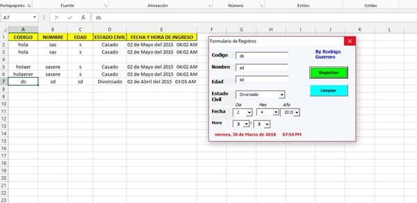 Private Sub CommandButton2_Click() If TextBox1 = "" Or TextBox2 = "" Or TextBox3 = "" Or ComboBox1 = "" Or ComboBox2 = "" Or ComboBox3 = "" Or ComboBox4 = "" Then MsgBox " Faltar llenar algunos campos", vbInformation, "Completar" Else: Range("a" & Cells.Rows.Count).End(xlUp).Offset(1).Select ActiveCell = TextBox1.Value ActiveCell.Offset(0, 1) = TextBox2.Value ActiveCell.Offset(0, 2) = TextBox3.Value ActiveCell.Offset(0, 3) = ComboBox1.Value Dim fecha As String fecha = ComboBox2.Text + "/" + ComboBox3.Text + "/" + ComboBox4.Text Dim hora As String hora = ComboBox5.Text + ":" + ComboBox6.Text ActiveCell.Offset(0, 4) = Format(fecha, "dd"" de ""mmmm"" del ""yyyy") + " " + Format(hora, "hh:mm AM/PM") MsgBox "Datos Registrados", vbOKOnly, " Registro" End If End Sub