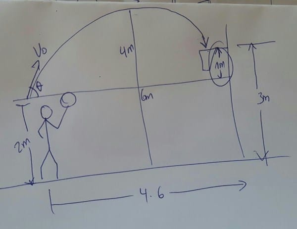 El jugador realiza el lanzamiento a 2m de altura y se sabe que la canasta esta a una altura de 3m.