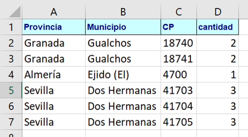 Lo que necesito es duplicar cada fila las veces necesarias para que cada código este en una fila con toda la información. Para ello la celda cantidad.