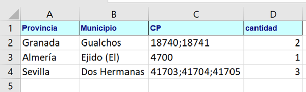 La tabla es un ejemplo, la celda cantidad es el numero de códigos separados por ; que hay en la celda CP.