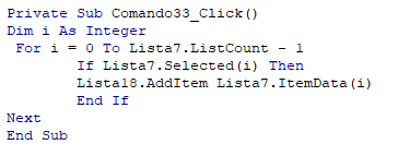 Private Sub btnllevar_Click() 'lleva los items a la pagina "Consultar APU" For i = 0 To lbAPU.ListCount - 1 If lbAPU.Selected(i) Then frmConsultar.cbxitm.AddItem lbAPU.List(i) frmConsultar.lbxAPU.List(frmConsultar.lbxAPU.ListCount - 1, 3) = lbAPU.List(i, 1) End If Next MsgBox "Los items han sido enviados" End Sub