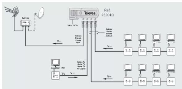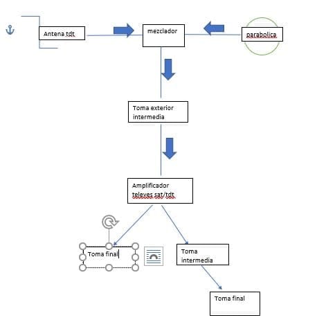 Os paso un esquema de como tengo la instalación de antena de mi casa. No veo el satélite ni en las tomas intermedias ni finales. Creo que está todo correctamente ya que si pongo cable directo desde"toma exterior intermedia"hasta el decodificador la señal llega correctamente. Por lo que intuyo que a partir de ahí es cuando falla algo que no sé que es. Espero vuestros comentarios,