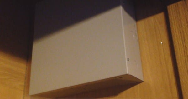 Tambien he encontrado en la terraza, (soportando lluvia) otra caja que yo diria que es el 'chivato' que pitaria y emitiria luz en el exterior. Este estaba suelto por ahi, en la terraza, no se si es porque es inalambrico o porque lo han desenchufado de su cable.
