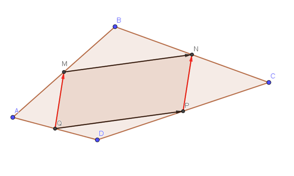 Demostrar en forma vectorial el enunciado geométrico: si se unen en forma sucesiva los puntos medios de un cuadrilátero ABCD cualquiera, la figura generada es un paralelogramo.
