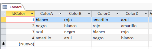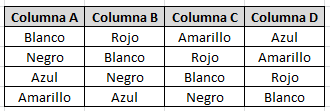 Total: 5 valores naturales en las 4 columnas ( Blanco, Negro, Azul, Amarillo, Rojo )