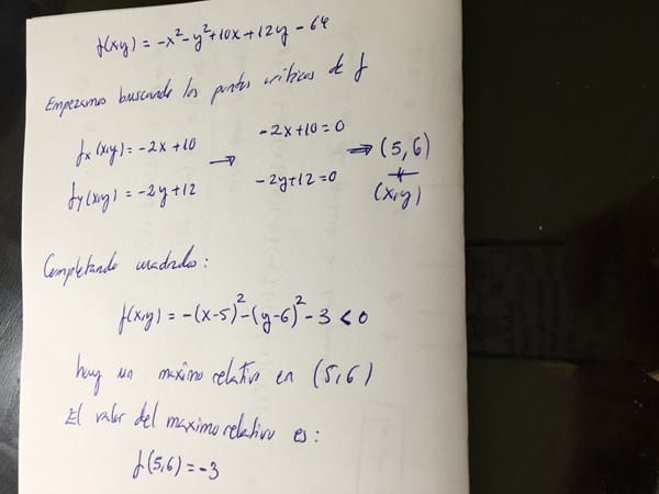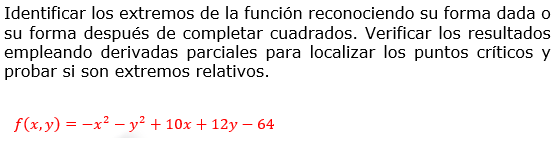Identificar los extremos de la función reconociendo su forma dada o su forma después de completar cuadrados. Verificar los resultados empleando derivadas parciales para localizar los puntos críticos y probar si son extremos relativos