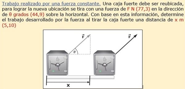 Una caja fuerte debe ser re ubicada, para lograr la nueva ubicación se tira con una fuerza de F N (77,3) en la dirección de θ grados (44,9) sobre la horizontal. Con base en esta información, determine el trabajo desarrollado por la fuerza al tirar la caja fuerte una distancia de x m (5,10)
