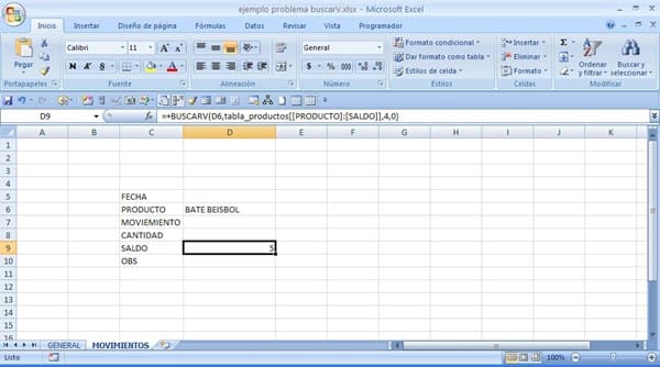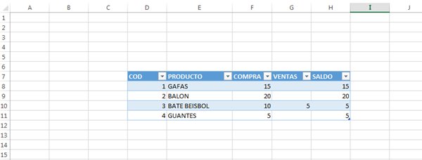 Tengo una hoja llamada General con la siguiente tabla (tabla_productos)