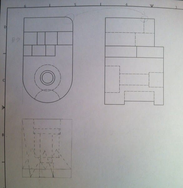 ¿Hola qué tal? Tengo una duda con este plano de una pieza, la tarea a realizar es dibujar aproximadamente el plano de planta y realizar un corte. La cuestión es que el profesor que nos da esta materia parece tener pocas ganas de que aprobemos y nos ha dado para representar esta y varias otras piezas que son prácticamente imposibles para lo que nos han enseñado hasta ahora. ¿Alguien me puede orientar? He intentado hacer una vista de planta pero no estoy seguro de qué tan acertado he estado en su representación. Tampoco puedo entender qué es la muesca que marqué arriba. Si me pueden orientar donde posicionar un corte.