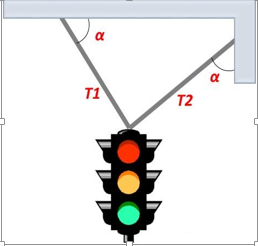Un semáforo de m kg (12,0), está suspendido tal como se muestra en la figura, donde el ángulo tiene un valor de . Respecto al sistema se necesita saber si la tensión del cable más inclinado (T1) es mayor o menor que la del otro cable (T2). Para ello realice el siguiente procedimiento:
