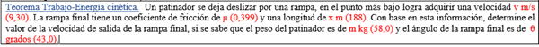 Teorema Trabajo-Energía cinética: Un patinador se deja deslizar por una rampa, en el punto más bajo logra adquirir una velocidad v m/s (9,30). La rampa final tiene un coeficiente de fricción de μ (0,399) y una longitud de x m (188). Con base en esta información, determine el valor de la velocidad de salida de la rampa final, si se sabe que el peso del patinador es de m kg (58,0) y el ángulo de la rampa final es de θ grados (43,0).
