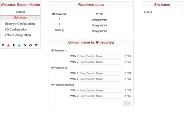 Tengo entre manos una central de alarma Paradox SP6000, cuando accedo a ella mediante el navegador con el modulo IP150 y después de poner el código del teclado, entro en el menú de configuración.