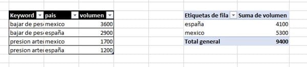 Tengo un excel donde en la columna B tengo palabras claves (dinosaurios, tiranosaurio rex, etc - las palabras claves son las busquedas que hace la gente en google y cada pais arroja una cantidad diferente de busquedas de otro pais), en la columna C tengo el país al cual pertenece esa palabra clave, en la columna E tengo la cantidad de busquedas que la palabra clave tiene en dicho país.