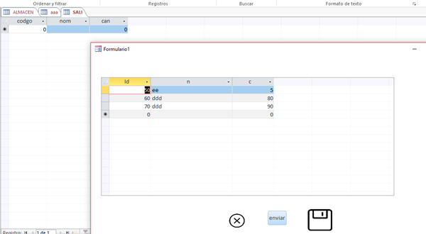 Pero lo único que consigo es que guarde el ultimo registro que se encuentra en el formulario (70, ddd, 90) como se muestra en la imagen.