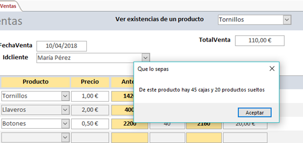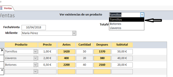 Calculo el stock mediante un boton en el formulario donde registro las ventas y evito que se recalcule mediante el campo si/no "AStock". Hasta ahí todo bien.