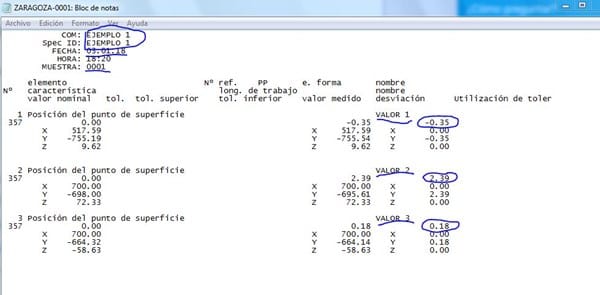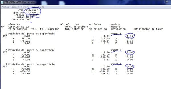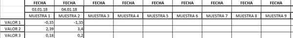 Me interesan los datos "FECHA", "MUESTRA", y los datos que cada día van a ser diferentes debajo de "VALOR 1"; "VALOR 2" y "VALOR 3", que he remarcado en la imagen en un circulo.
