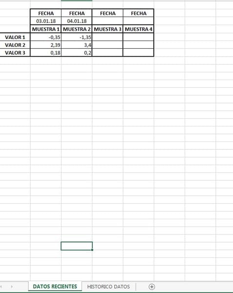Que en esa hoja excel "DATOS RECIENTES" solo aparezcan 4 datos y estos vayan yendose solapando-machacando día tras día. Pero que en la pestaña "HISTORICO DATOS" se puedan ir acumulando todos los datos a modo de histórico de esta manera.