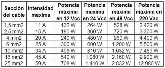 Ah, si alargas los cables mucho has de tener en cuenta esta otra tabla: